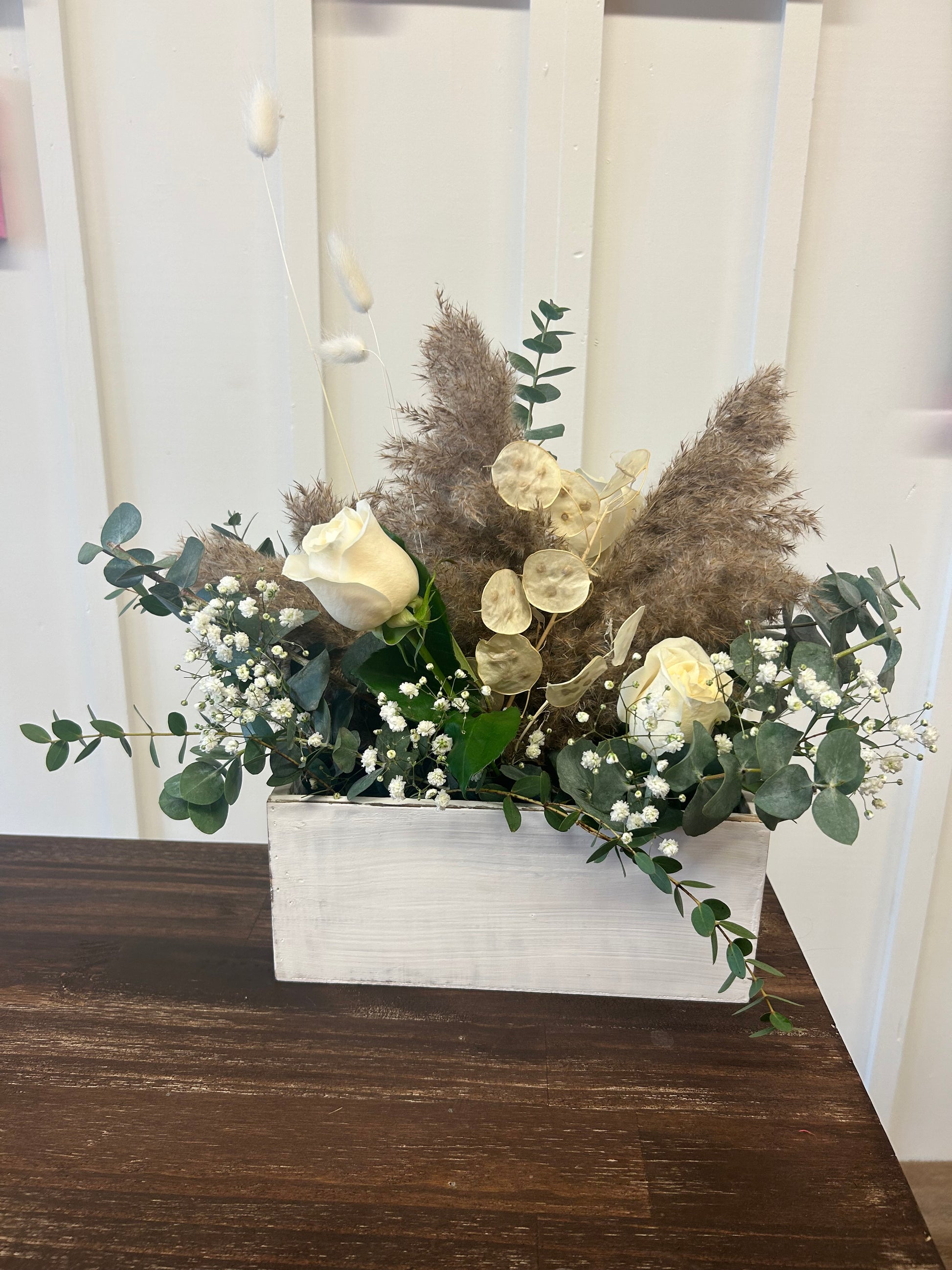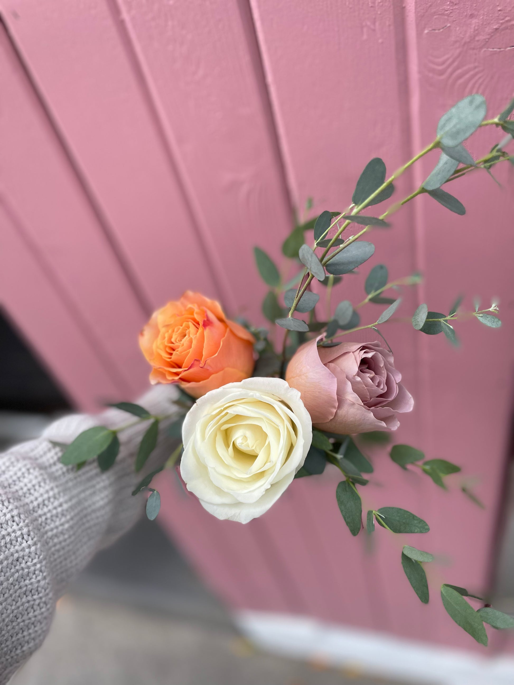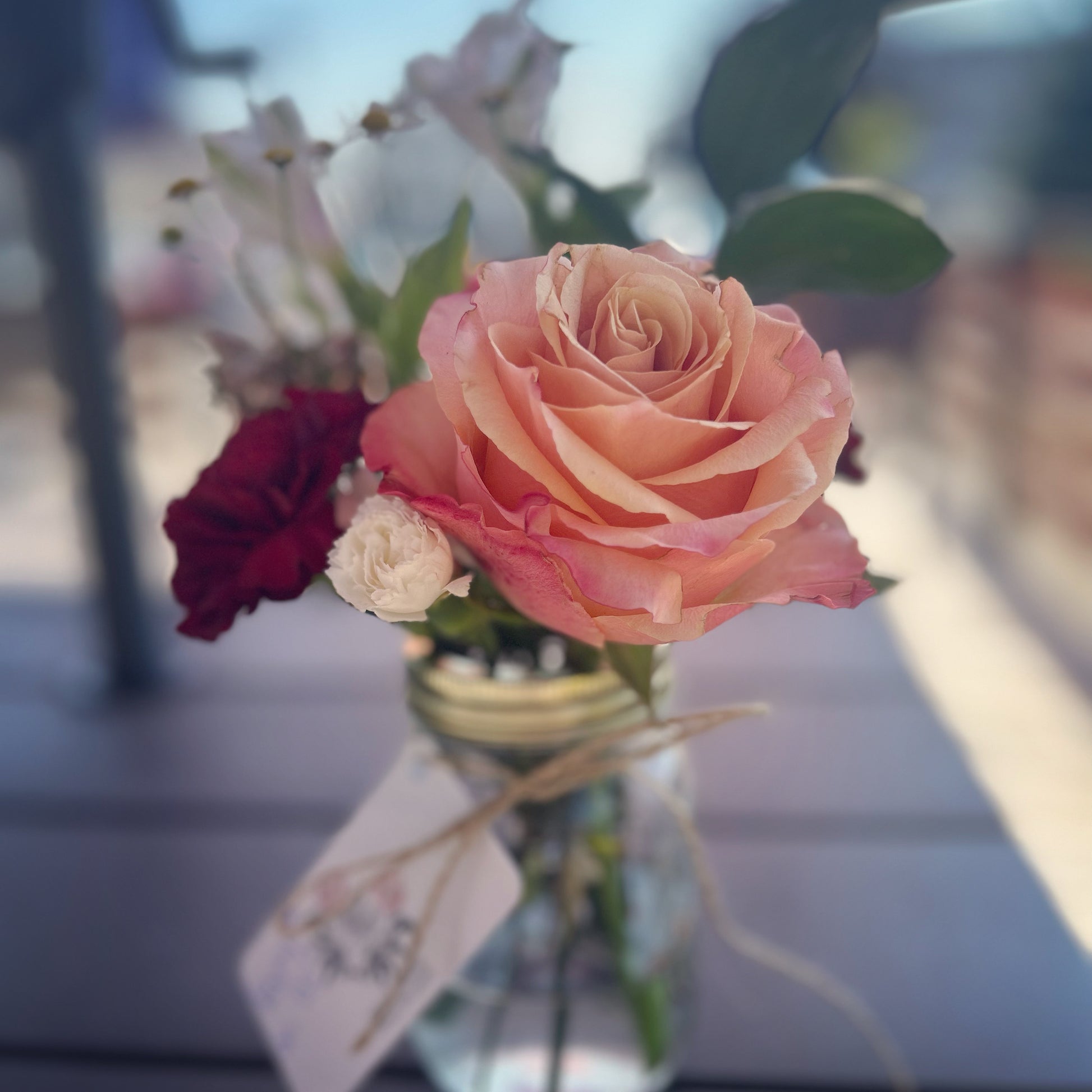 Our mason jar arrangements will feature roses as the main focal flower, but also typically include a mix of other flowers + greenery (dependent on seasonal availability of blooms); if you would like a rose-only mason jar arrangement, please request that in the Notes section at Check Out.