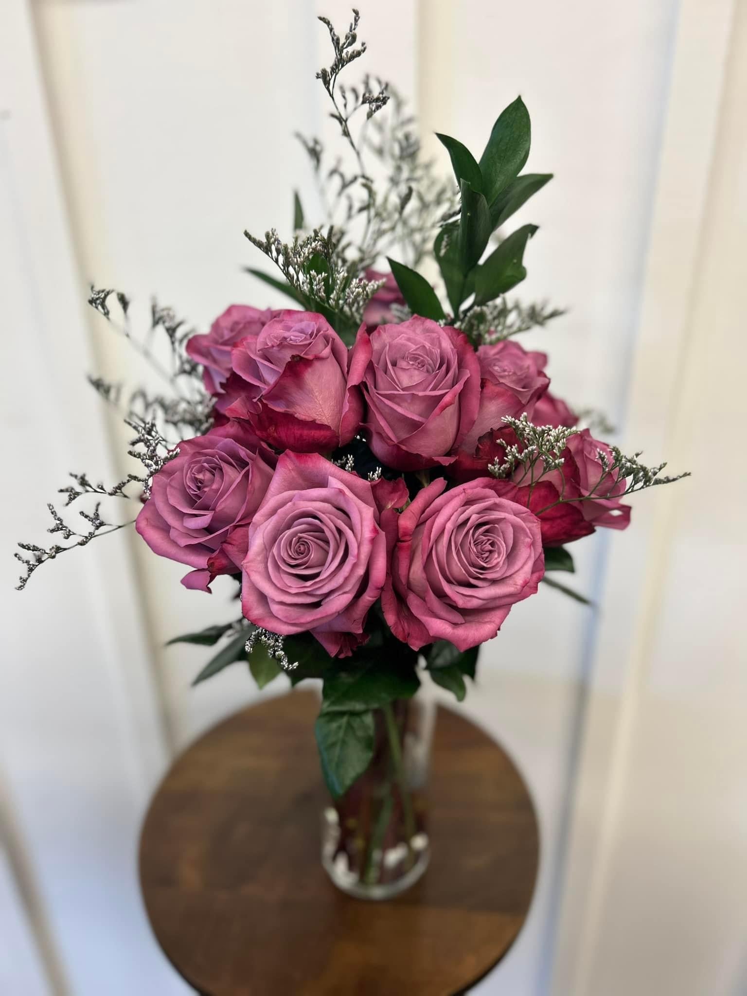 Beautiful bouquets of long-stemmed roses elegantly arranged with greenery + accent flowers (will depend on what is available in the cooler at time of purchase); your choice of hand-tied (no vase), vase or box arrangements in a variety of colours + sizes. Please specify colour choice in the Notes section at Check Out + we will do our best to accommodate - if you require a specific colour please order ahead at least 7 days.
