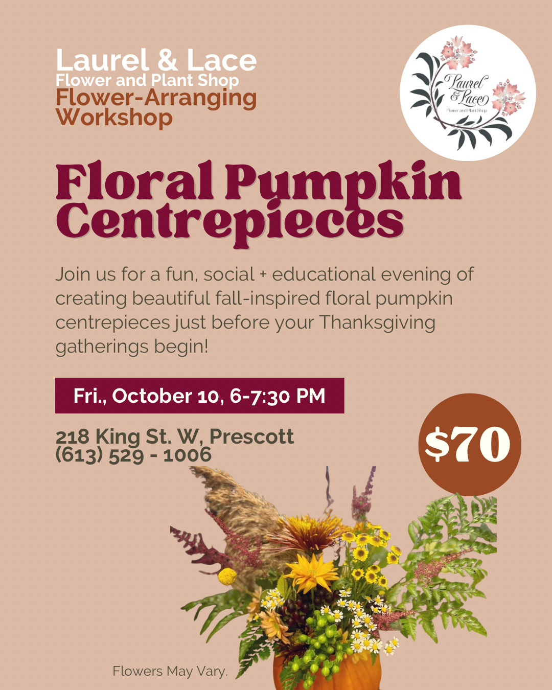 Enjoy a night of creating eye-catching pumpkin floral arrangements within a group setting in Laurel & Lace Flower and Plant Shop. With guided instruction and hands-on help, you will learn how to design and construct a pumpkin floral centrepiece using fall-themed focal and filler flowers, greenery and accents in floral foam or a jar - and then take them home to enjoy just in time for the Thanksgiving celebrations!