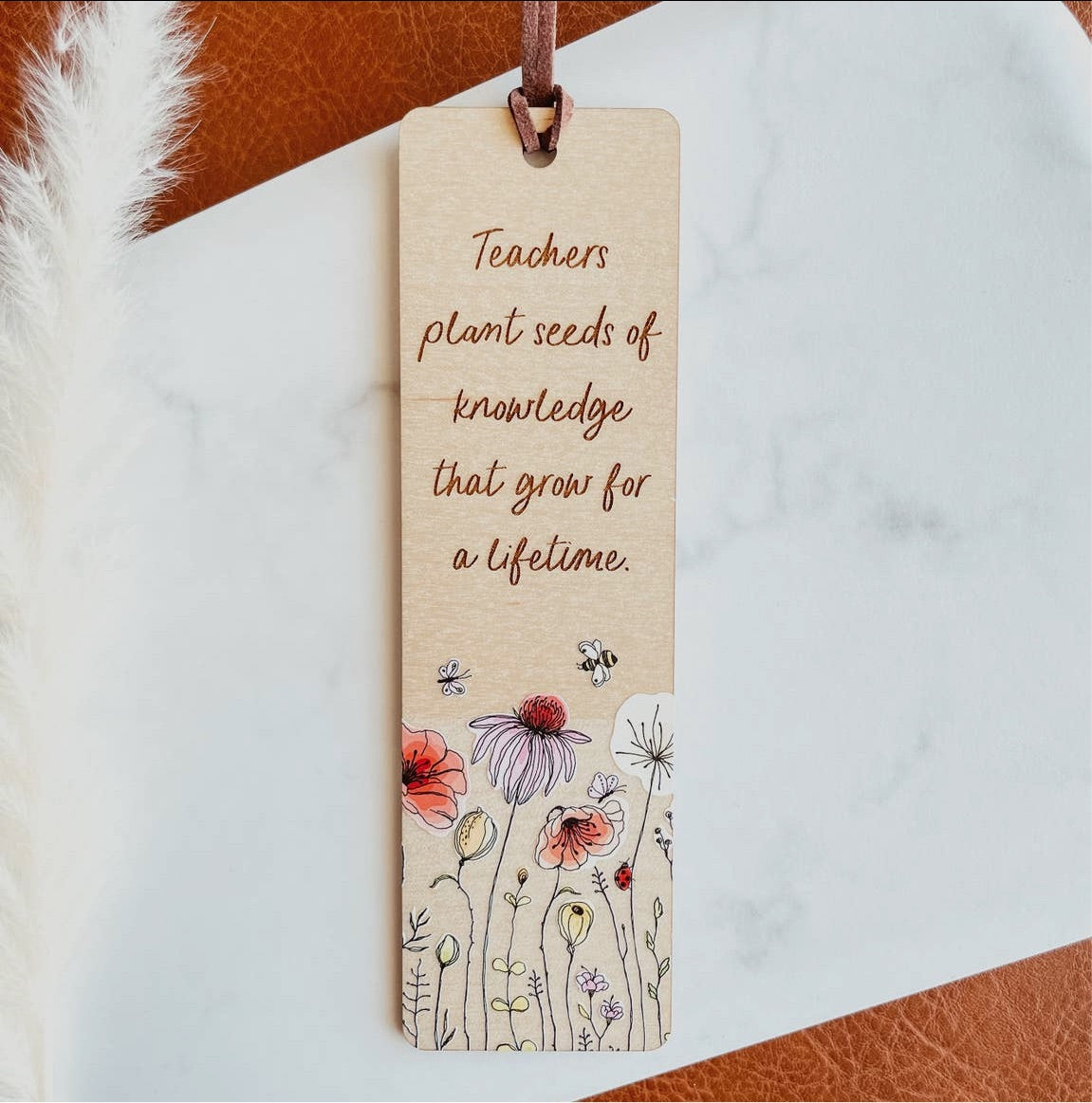Each bookmark is cut from 1/8 inch thick maple veneer and engraved. The florals are printed with ink. Measurements: 6x1.75". Made by a fellow small business in Canada.